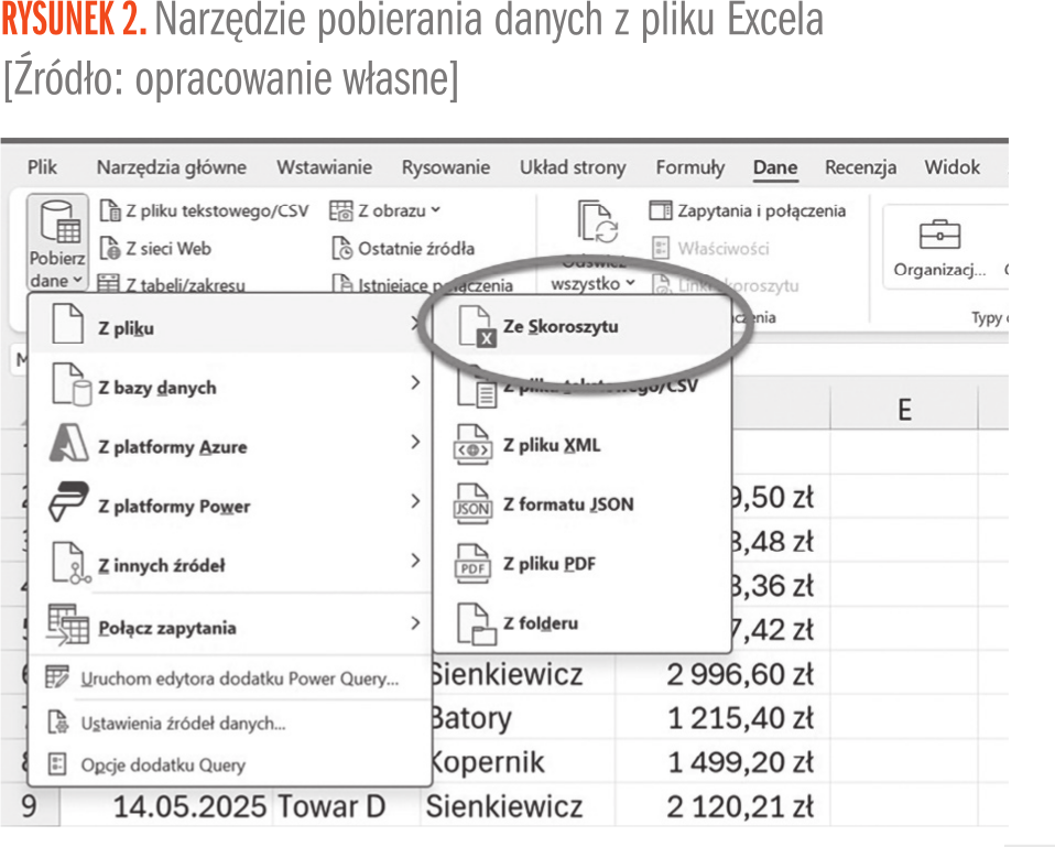 Power Query jest narzędziem, które służy do szeroko pojętego pobierania i przekształcania danych. Aby móc z nim pracować, trzeba załadować do niego dane. W naszym przypadku w pliku z danymi wybieramy na wstążce na karcie „Dane” narzędzie „Pobierz dane”, następnie opcję „Z pliku”, a potem „Ze skoroszytu” (opcja ta została pokazana na Rysunku 2).