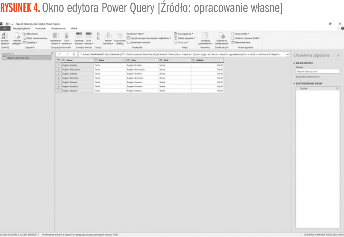 Po zaznaczeniu tej opcji w prawym dolnym rogu okna wybieramy opcję „Przekształć dane”. Dzięki temu otworzy nam się okno edytora Power Query, widoczne na Rysunku 4.
