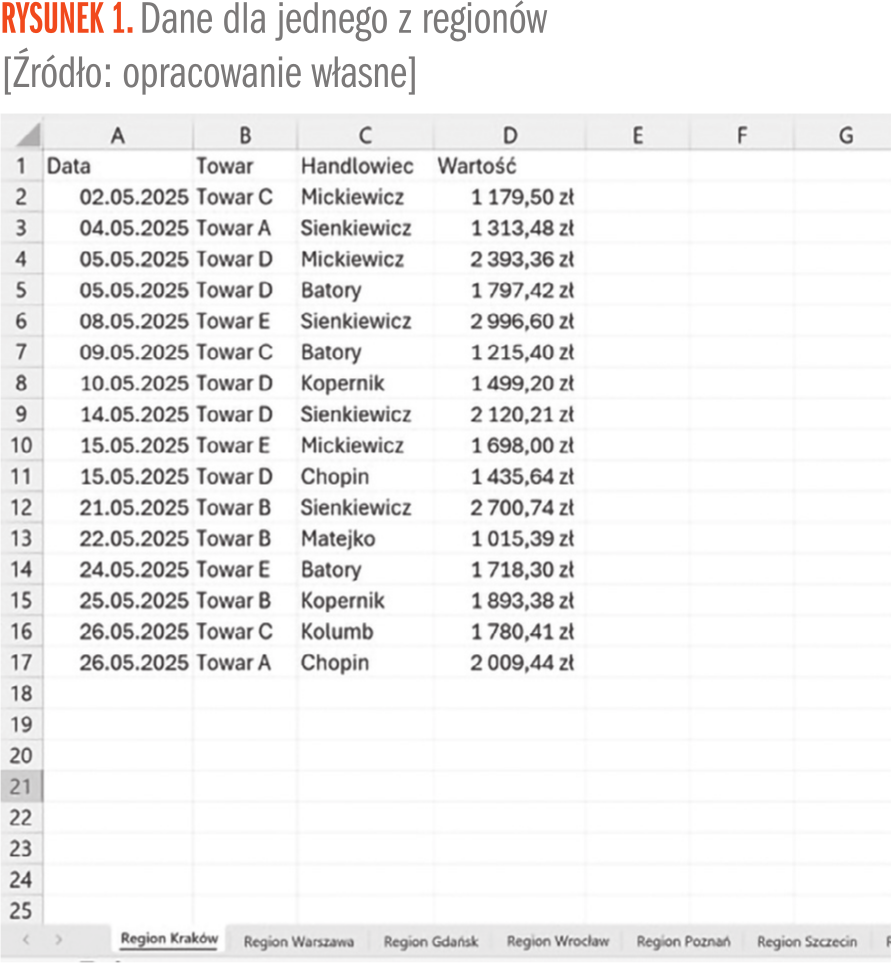 Załóżmy więc, że mamy plik Excela, a w nim 7 arkuszy z danymi z poszczególnych regionów odnośnie do sprzedaży towarów osiągniętej przez poszczególnych handlowców w ciągu jednego miesiąca. Dane dla pierwszego regionu pokazane zostały na Rysunku 1.