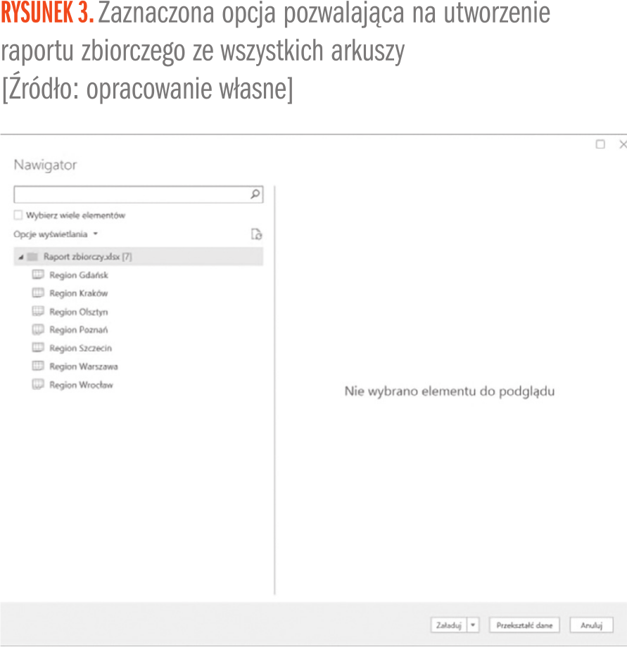Pojawi nam się okno, w którym musimy wybrać interesujący nas plik z danymi (jest to w naszym przypadku ten sam plik, w którym pracujemy). Po wyborze klikamy opcję „Importuj”. Pojawi nam się wtedy bardzo ważne okno – okno Nawigatora. Jest to okno, w którym musimy zdecydować, co dokładnie ze wskazanego pliku chcemy pobrać. Jeśli z lewej strony tego okna wskażemy jeden konkretny arkusz, to pobierzemy dane tylko z tego jednego konkretnego arkusza. Jeśli jednak chcemy pobrać dane ze wszystkich arkuszy i utworzyć z nich raport zbiorczy, to musimy w lewej części tego okna zaznaczyć nazwę pliku z żółtą ikoną folderu (zostało to pokazane na Rysunku 3).