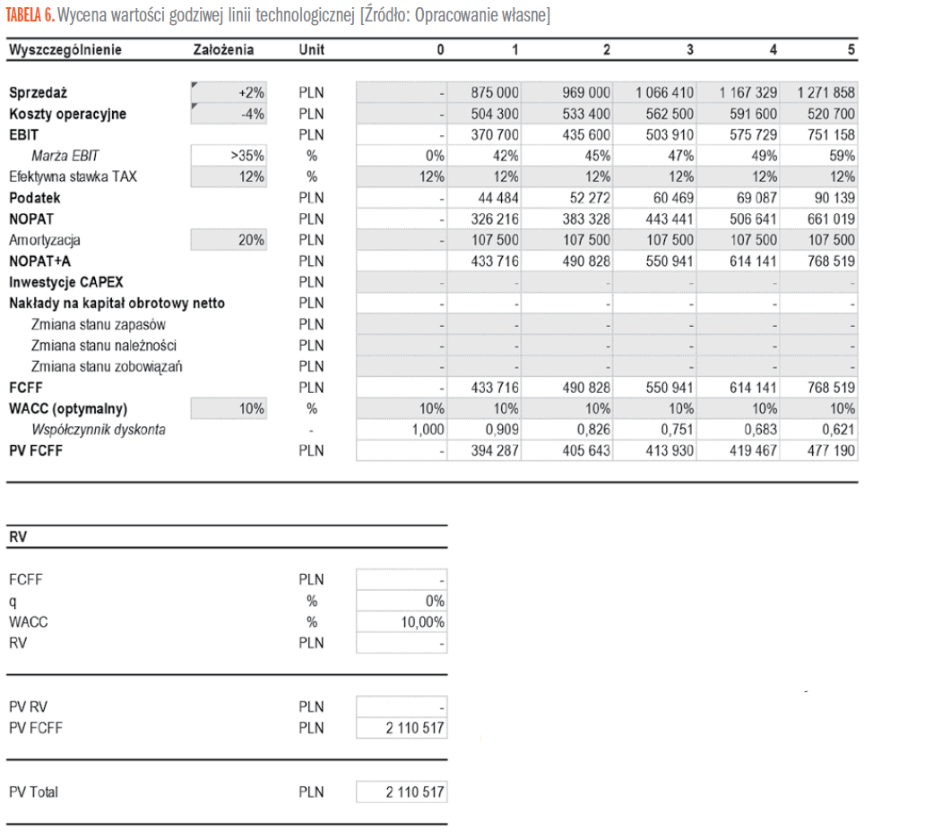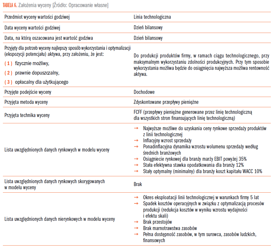 Na dzień bilansowy dokonano oszacowania wartości godziwej linii technologicznej. Założenia wyceny zawarto w poniższej tabeli 6.
