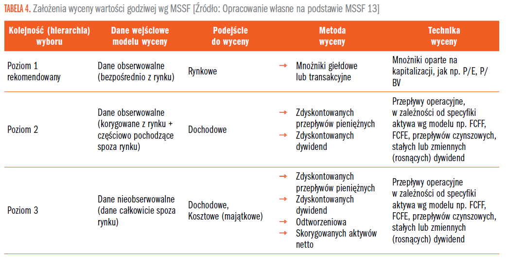 Do wyceny wartości godziwej zaleca się wykorzystanie podejść, metod, technik, które w największym stopniu bazują na danych obserwowalnych, obiektywnych i możliwych do zweryfikowania. Wytyczne w tym zakresie zawiera MSSF 13, co zbiorczo prezentuje tabela 4.