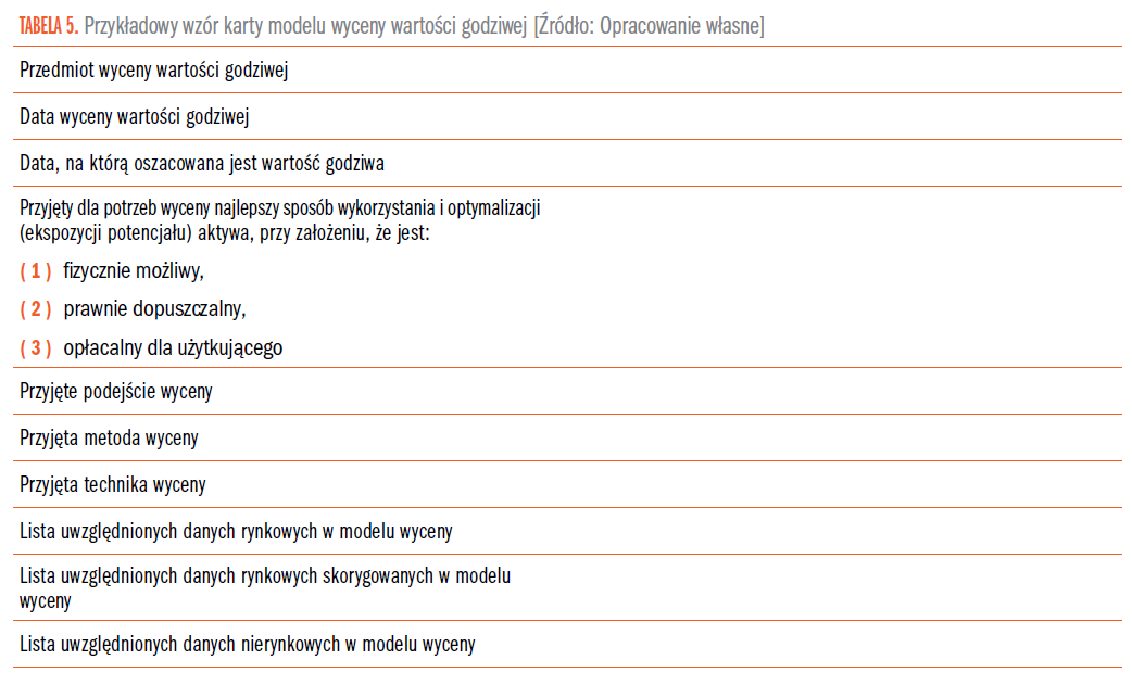 Budując model wyceny wartości godziwej zasadnym jest wskazanie, która część danych wejściowych (założeń) modelu pochodzi z rynku (bazuje na danych obserwowalnych). Można skorzystać w tym celu z poniższej tabeli 5, stanowiącej wzór karty modelu, w którym zestawione są podstawowe informacje o przyjętych założeniach wyceny wartości godziwej danego aktywa lub zobowiązania. Powyższa karta może być przydatna w procesie weryfikacji i uzasadnienia wykorzystania wyniku wyceny, na przykład w bilansowej sprawozdawczości finansowej, decyzjach managerskich, systemach motywacji lub procesach transakcyjnych.