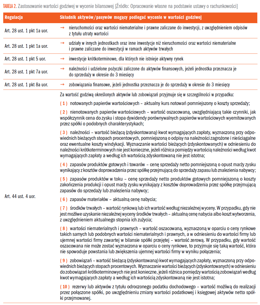 Obszary ustawy o rachunkowości, w jakich wartość godziwa znajduje zastosowanie zawiera tabela 2.