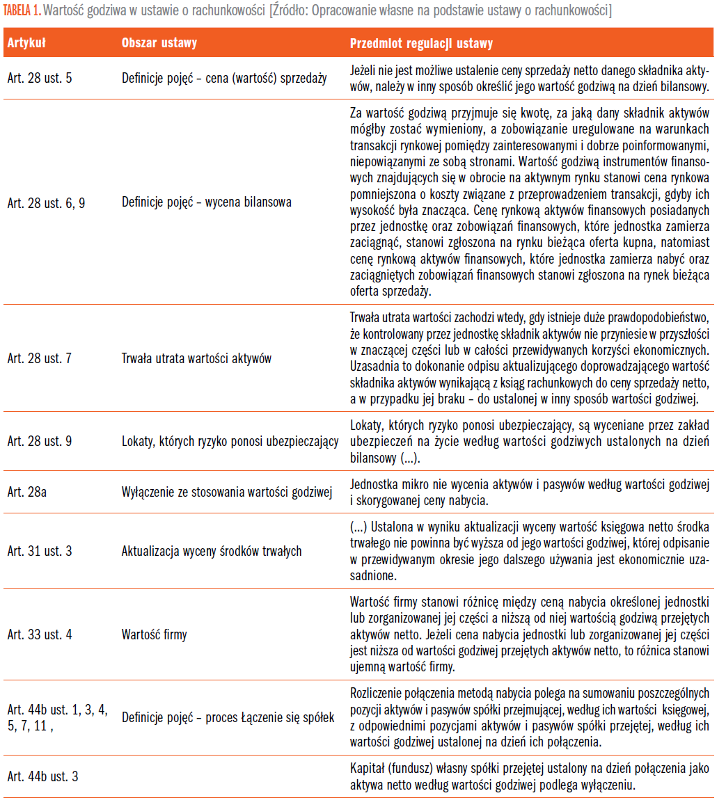 Pojęcie wartości godziwej pojawia się często w ustawie o rachunkowości, co prezentuje tabela 1.
