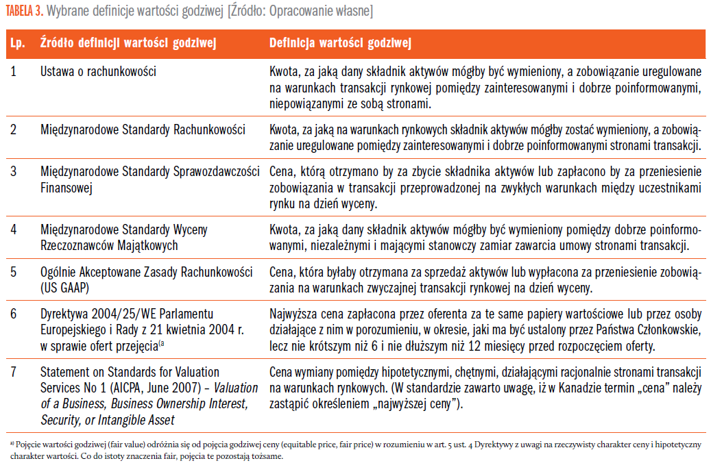 Koncepcja wartości godziwej wykształciła się z dążenia rachunkowości do harmonizacji (redukcji stosowanych praktyk) i standaryzacji (unifikacji dopuszczalnych praktyk), w zakresie porównywalności wycenianych wartości. Reprezentujący podejście transakcyjne koszt historyczny pozwala obiektywnie odwzorować stan przeszły. Nie wykazuje jednak przydatności w odwzorowywaniu potencjału dóbr do tworzenia wartości. W tabeli 3 zawarto wybrane definicje wartości godziwej.