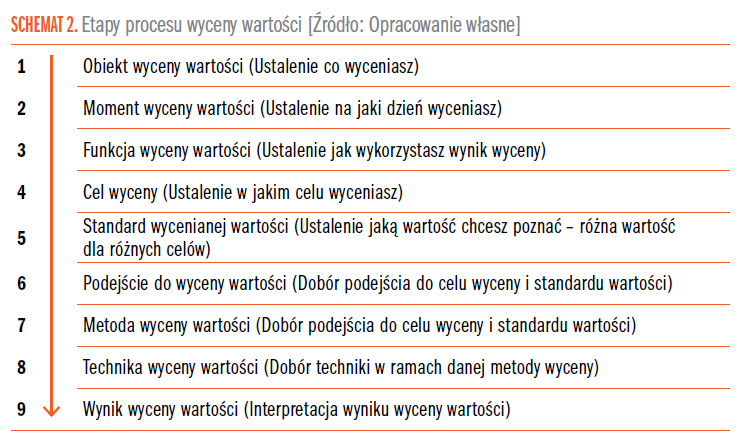 Sposób wykorzystania wyniku wyceny określa cel wyceny, podporządkowany funkcji wyceny. Zgodność wyniku wyceny z założeniami standardu wartości zapewnia konstrukcja i sposób aplikacji założeń wyceny. Zmiana na poziomie któregokolwiek etapu procesu wyceny wpływa na zmianę wyniku wyceny. Etapy procesu wyceny przedstawia schemat 2.