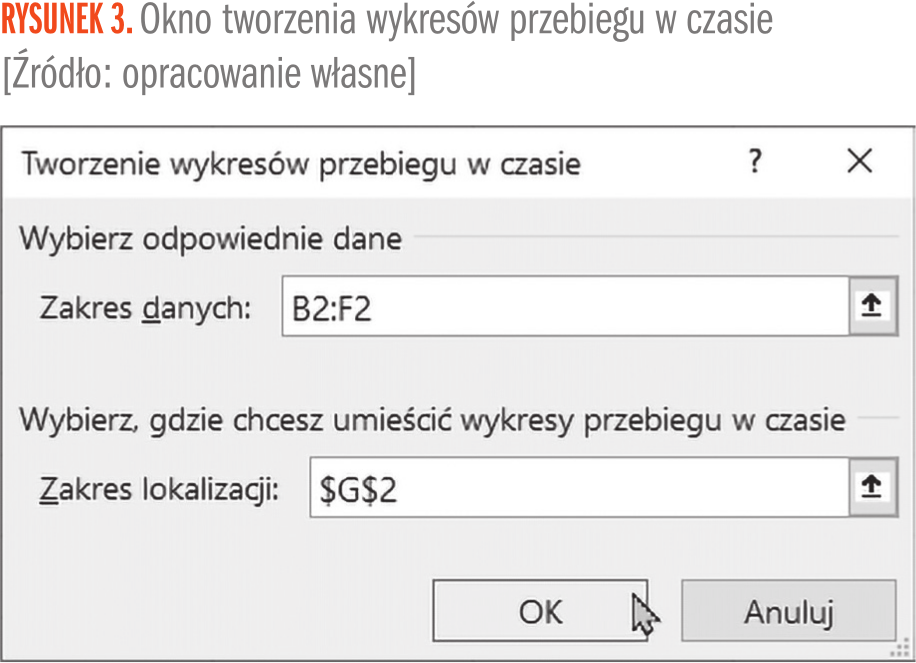 Spowoduje to otworzenie okna „Tworzenie wykresów przebiegu w czasie” (Rysunek 3), gdzie potrzebujemy dołożyć odwołanie do komórki (G2) w polu „Zakres lokalizacji”. Najpierw klikamy w to pole, a następnie na komórkę G2.