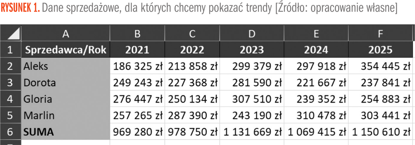 Dla każdego sprzedawcy oraz sumy chcemy przygotować prosty wykres liniowy, pokazujący trend sprzedaży. Dodatkowo zaznaczymy na nim punkt z największą i najmniejszą wartością. Właśnie do tego najlepiej nadają się wykresy przebiegu w czasie, które wstawiamy w pojedynczą komórkę arkusza. Dlatego rozmiar wykresu zależy od rozmiaru komórki.
