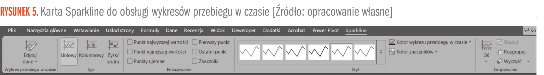 Jeśli mamy zaznaczoną komórkę z wykresem przebiegu w czasie, to Excel będzie pokazywał dodatkową kartę je obsługującą (Rysunek 5). W zależności od wersji Excela karta ta może być inną nazwę.