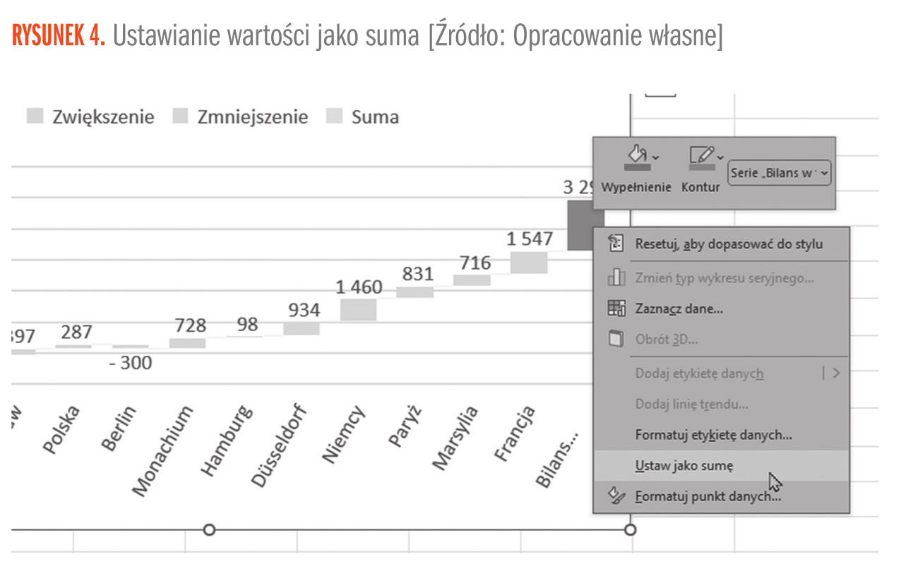 Żaden punkt nie trafi automatycznie do ‘serii’ Suma. Musimy sami powiedzieć Excelowi, które punkty/wartości mają należeć do tej serii. Żeby to zrobić, klikamy najpierw na konkretny punkt (kolumnę z wartością) dwa razy lewym przyciskiem myszy, żeby tylko on był zaznaczony, a następnie prawym przyciskiem myszy, by z podręcznego menu wybrać opcję Ustaw jako sumę (Rysunek 4).