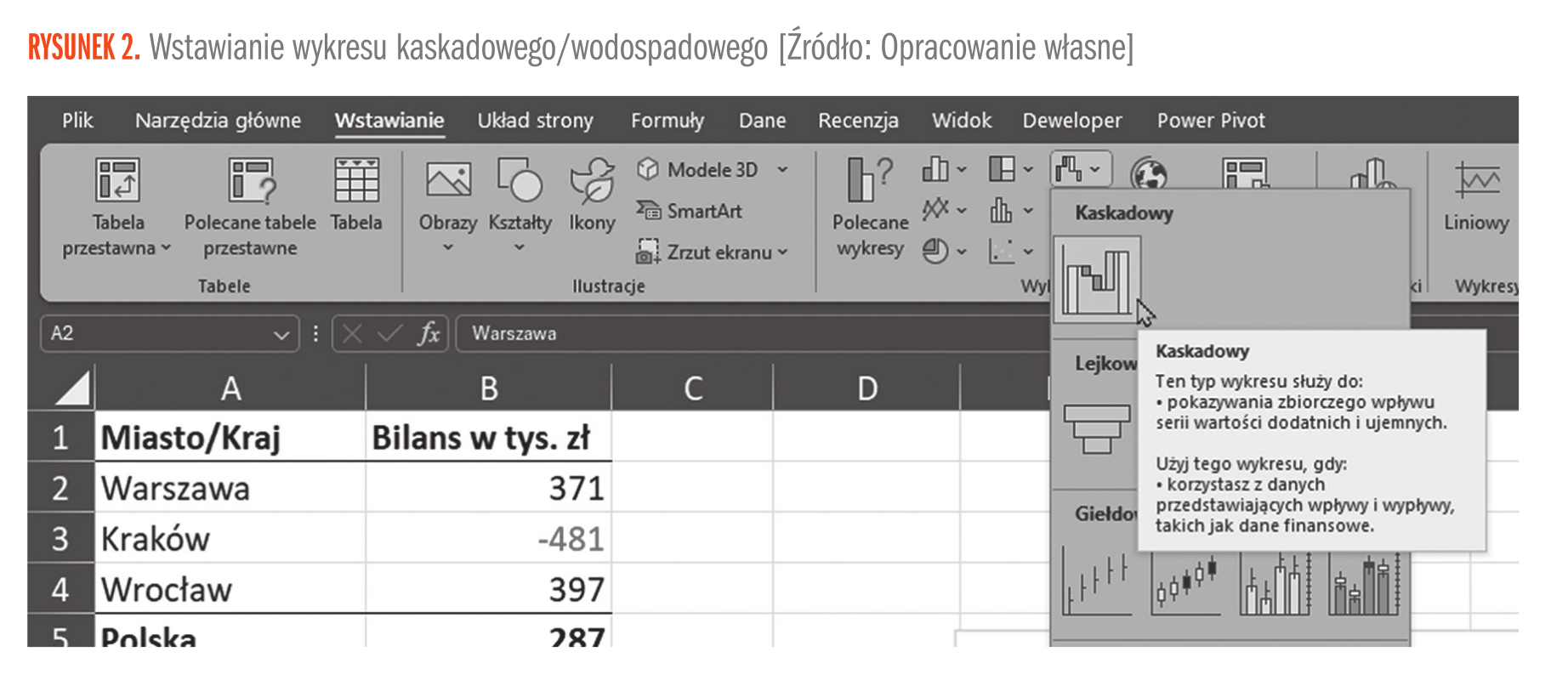 Gdy mamy już poprawnie przygotowane dane, wystarczy zaznaczyć w nich dowolną komórkę, a następnie na karcie Wstawianie odnaleźć wykres Kaskadowy/Wodospadowy (Rysunek 2).