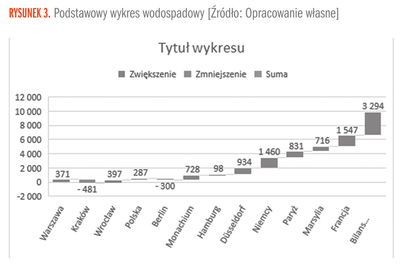 Excel wstawi nam teraz wykres wodospadowy, gdzie wszystkie ujemne wartości trafią do ‘serii’ Zmniejszenie, a wszystkie dodatnie do ‘serii’ Zwiększenie (Rysunek 3).