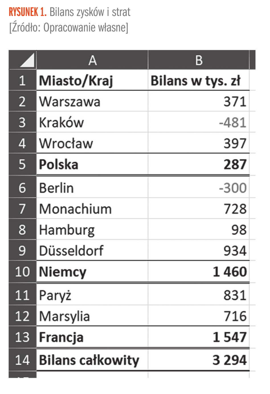My rozpatrzymy przykład, gdzie chcemy zaprezentować bilans zysków i strat z poszczególnych miast w których operujemy wraz z podsumowaniami po krajach (Rysunek 1).