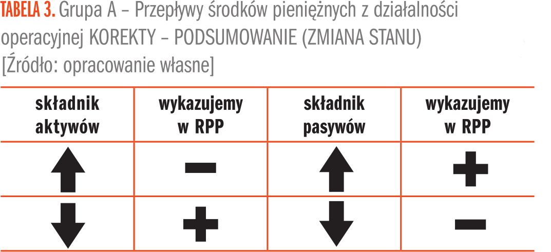- Doprowadzenia pozycji memoriałowych do „kasowych” poprzez uwzględnienie zmian stanu pozycji aktywów i pasywów (zapasów, należności, rozliczeń międzyokresowych, zobowiązań związanych z działalnością operacyjną).