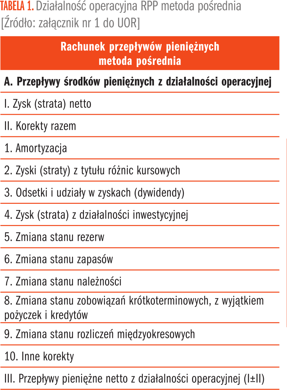 Pierwsza część rachunku przepływów pieniężnych (RPP) to grupa A, czyli „Przepływy środków pieniężnych z działalności operacyjnej”. Obejmuje ona przede wszystkim przepływy pieniężne dotyczące działalności operacyjnej, działalności statutowej, a więc podstawowej działalności jednostki, tej, do której prowadzenia jednostka została powołana, jak również inne rodzaje działalności, nie zaliczone do działalności inwestycyjnej (lokacyjnej) lub finansowej w rachunku przepływów pieniężnych. Wzór rachunku przepływów pieniężnych zawiera załącznik nr 1 do ustawy o rachunkowości (dalej UOR) – Zakres informacji wykazywanych w sprawozdaniu finansowym, o którym mowa w art. 45 ustawy, dla jednostek innych niż banki, zakłady ubezpieczeń i zakłady reasekuracji1. Szczegółowe zasady sporządzenia RPP określa Krajowy Standard Rachunkowości nr 1 Rachunek przepływów pieniężnych2, dalej KSR.